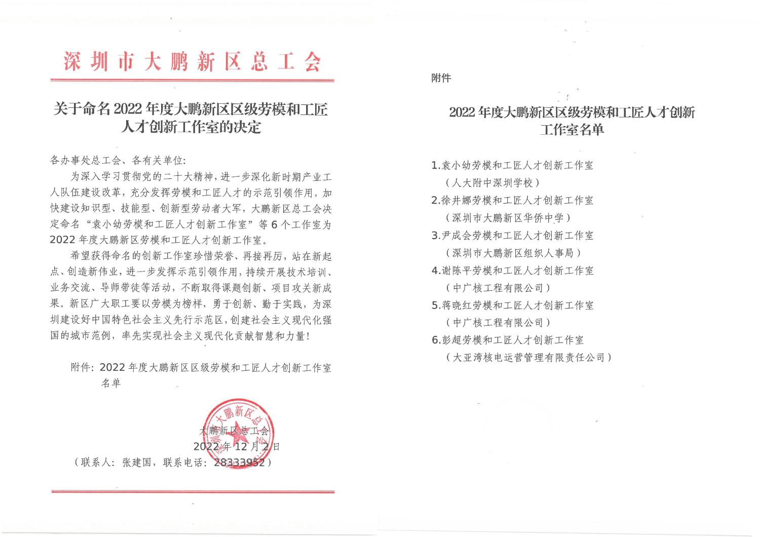 為深入學(xué)習貫徹黨的二十大精神,進一步深化新時期產(chǎn)業(yè)工人隊伍建設(shè)改革,充分發(fā)揮勞模和工匠人才的示范引領(lǐng)作用,加快建設(shè)知識型、技能型、創(chuàng)新型勞動者大軍,大鵬新區(qū)總工會12月發(fā)文命名了6個工作室為“2022年度大鵬新區(qū)勞模和工匠人才創(chuàng)新工作室”。工程公司設(shè)計院謝陳平創(chuàng)新工作室和設(shè)備采購與成套中心蔣曉紅創(chuàng)新工作室成功獲批“大鵬新區(qū)勞模和工匠人才創(chuàng)新工作室”。