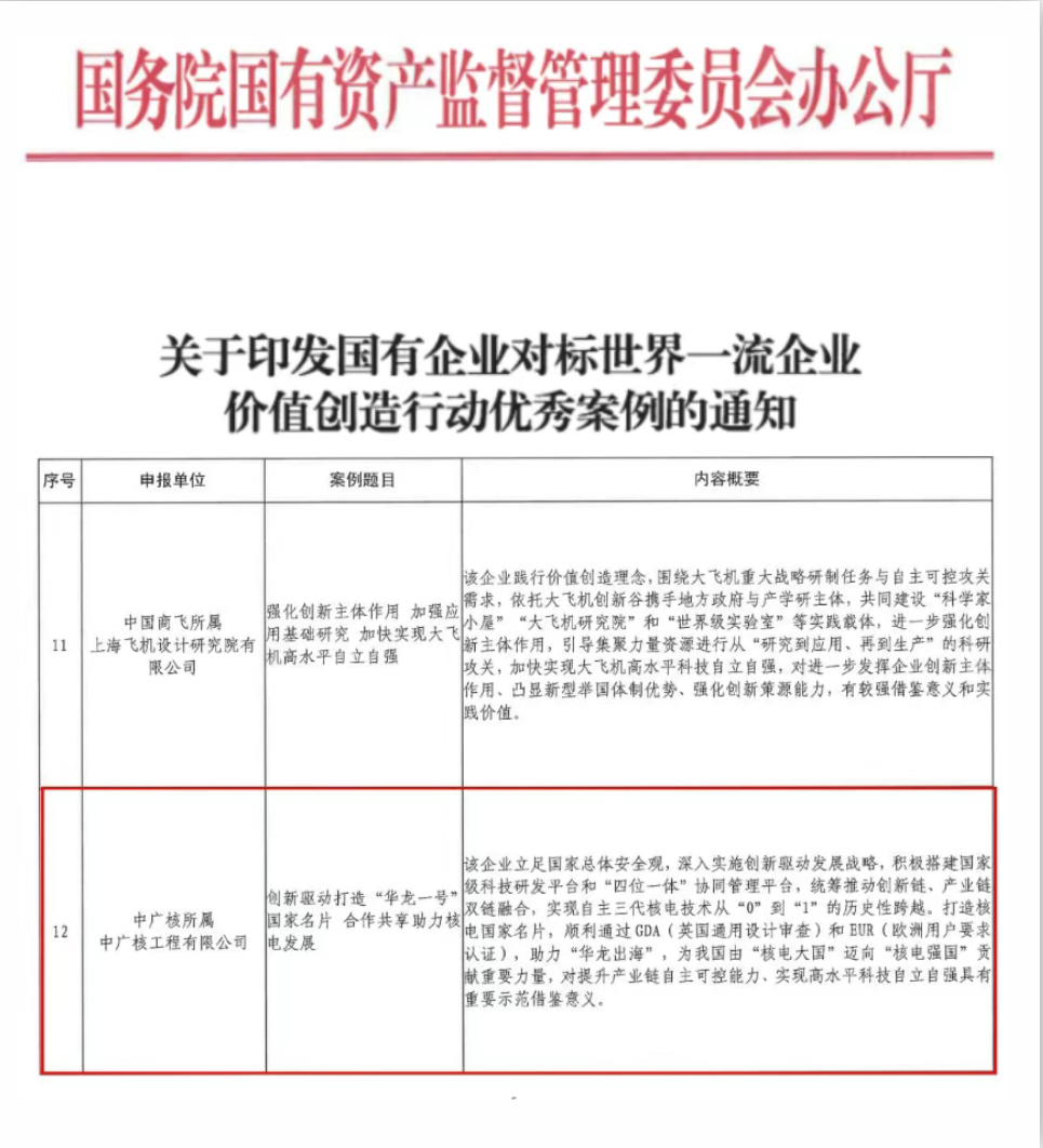 5月24日,國務(wù)院國有資產(chǎn)監(jiān)督管理委員會(以下簡稱“國資委”)下發(fā)了《關(guān)于印發(fā)國有企業(yè)對標(biāo)世界一流企業(yè)價值創(chuàng)造行動優(yōu)秀案例的通知》,評選出40個優(yōu)秀企業(yè)案例,中廣核工程有限公司(以下簡稱“中廣核工程”)申報的《創(chuàng)新驅(qū)動打造“華龍一號”國家名片,合作共享助力核電發(fā)展》成功入選,也是中國廣核集團(tuán)唯一入選案例。